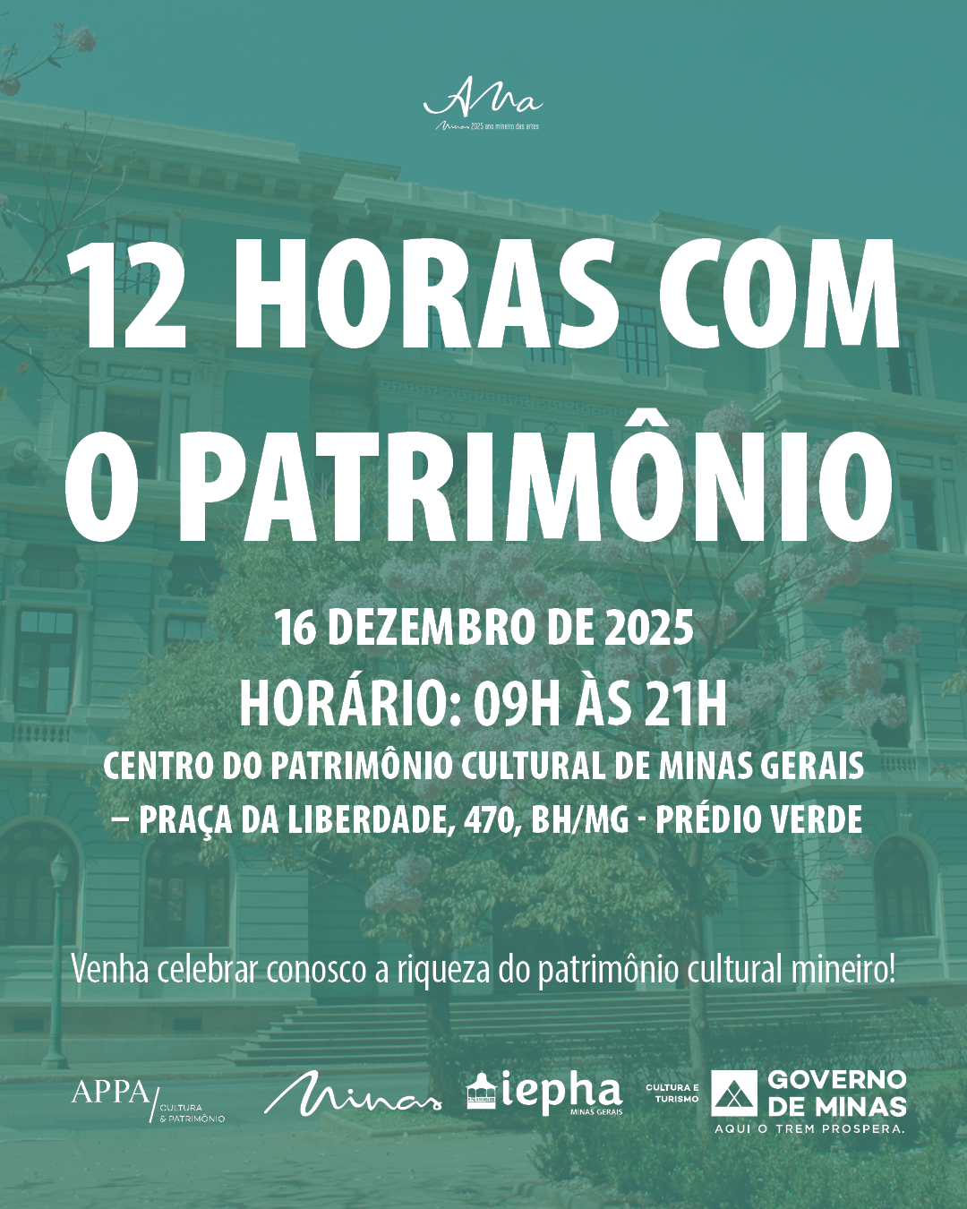 No dia 16 de dezembro, o Centro do Patrimônio Cultural Cemig será palco de uma programação especial que reúne cultura, memória e tradição. O Governo de Minas, por meio do Instituto Estadual do Patrimônio Histórico e Artístico de Minas Gerais (IEPHA-MG), em parceria com a APPA, realiza o evento “12 Horas com o Patrimônio”, uma experiência imersiva que valoriza os modos de fazer, os sabores e as expressões artísticas que compõem o patrimônio cultural mineiro.